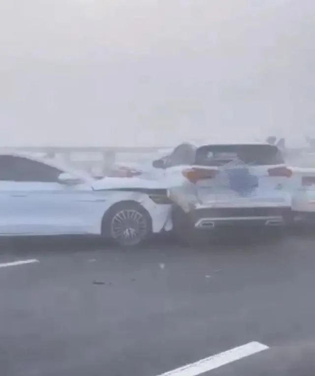 从车友提供的现场图片看,大桥上多辆车相撞,有的甚至叠在一起,有司乘人员在四周或拍照或察看车辆受损情况。同时,现场大雾笼罩。