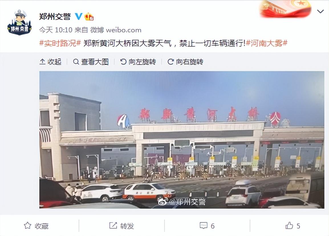 10点10分,郑州交警发布消息称,郑新黄河大桥因大雾天气,禁止一切车辆通行。