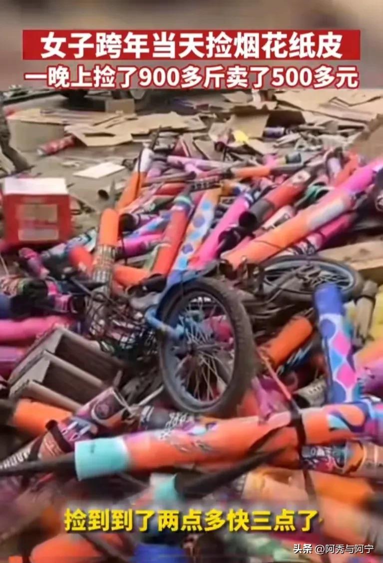 有网友爆料,自己在跨年夜当晚,从12点到3点左右,共计捡拾了900多斤的丢弃的烟花包装纸皮,卖了500多元。