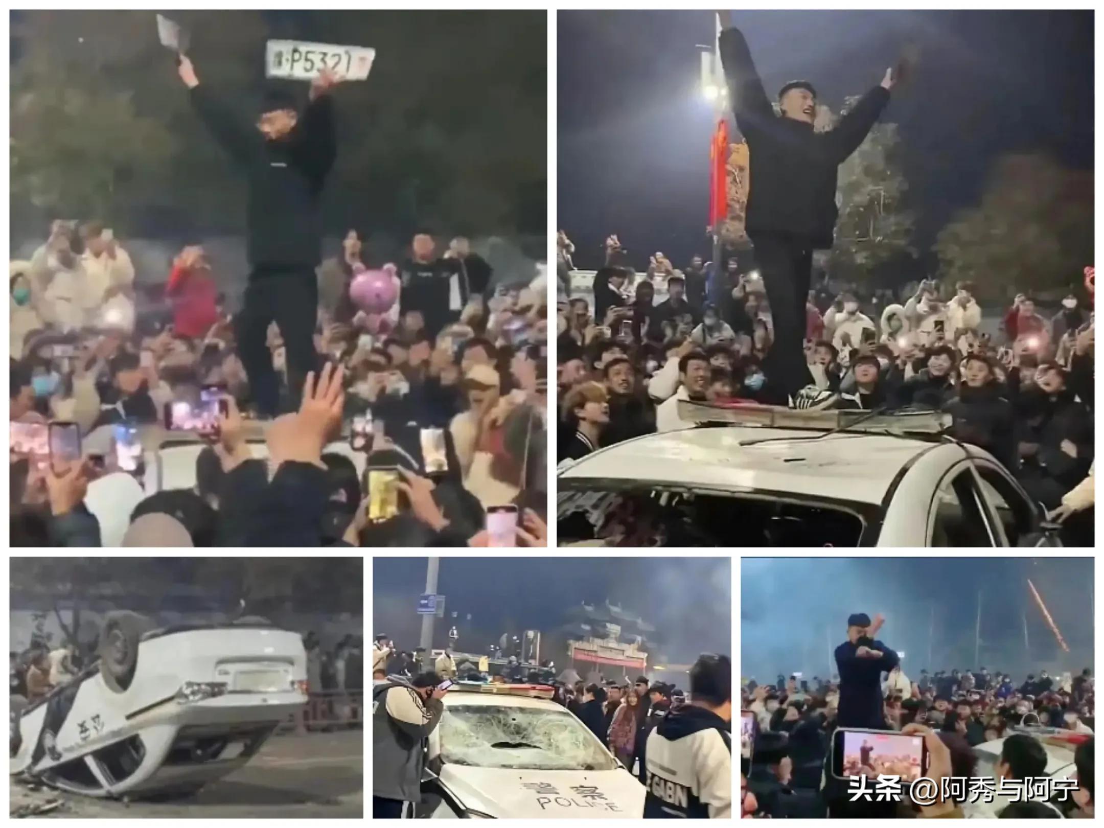 而围观的人群,更是有人开启了手机直播,有人欢呼喝彩,有人还大声叫好。生事者,还在警车上跳“摇手舞”,拿着车牌挥舞。