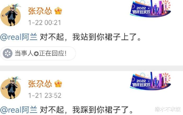 随后,踩到阿蓝裙子的张尕怂也两度发文给阿兰道歉,十分有趣。